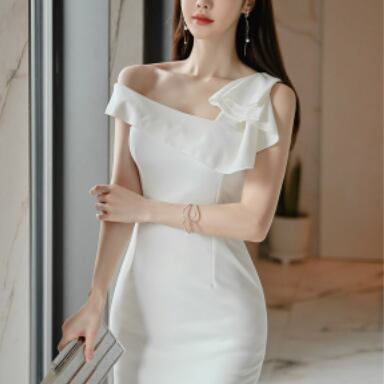 鎖骨ラインをセクシーにキレイ見せしてくれるワンショルダードレスです。