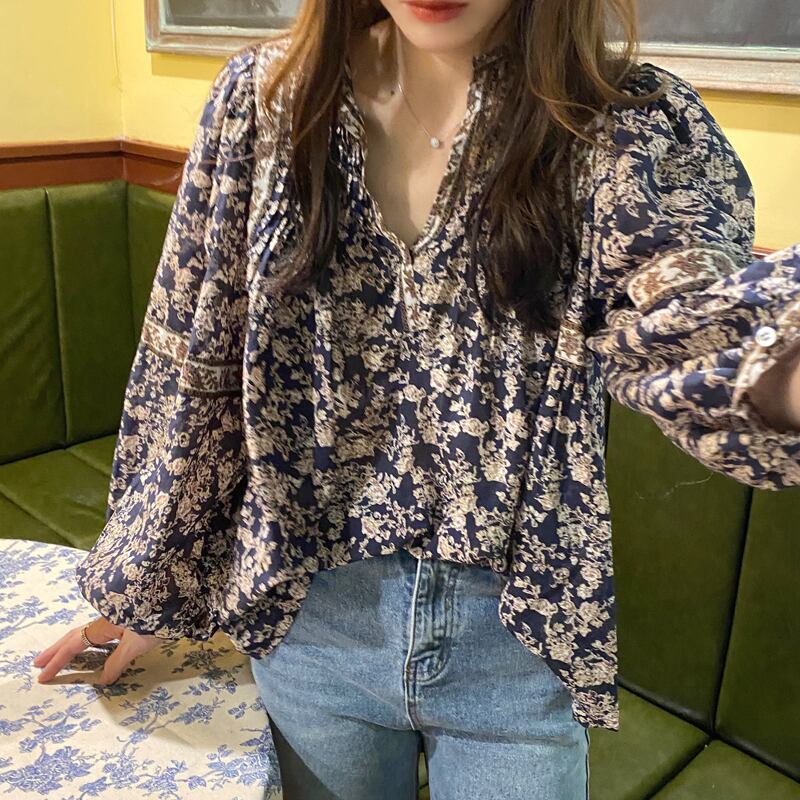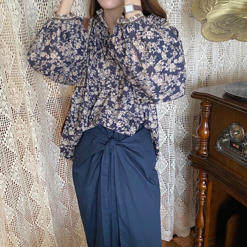 ブラウス フラワーモチーフ ネイビー レディース シャツ 花柄 前ボタン Vネック ボトルネック オープンカラー プルオーバー ランタンスリーブ バルーンスリーブ 長袖 プリーツ入り フォークロア エスニック ネイビー 青 カジュアル ラフ 公園 お買い物 秋 春 落着き 10代 20代 30代 40代 ふんわり袖 韓国 韓国ファッション リラックス お買い得 着回し ヘビロテ服 かわいい ノスタルジック ヴィンテージ 旅行 リゾート アウトドア リラックス服 低価格 高コスパ オーバーサイズ ロング丈