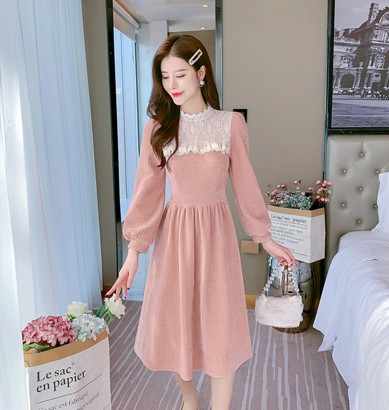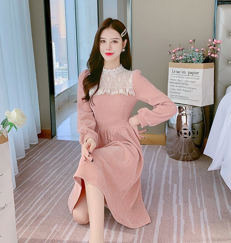 ワンピース フレアスカート ウエストマーク ピンク かわいい 膝下 袖あり 長袖 ボリューム袖 ボックスカラー レース ふんわり ひらひら 大人可愛い 大人 大人女子 きれいめ おしゃれ お洒落 可憐 ラブリー キュート ガーリー フェミニン レディース 10代 20代 30代 通勤 学生 通学 デート お出かけ 女子会 休日 普段使い カジュアル お嬢様 インスタ映え こなれ感 抜け感 着回し モテ ラフ ルーズ ゆったり ゆる 楽ちん とろみ感 上品 エレガント 二次会 披露宴 パーティー イベント