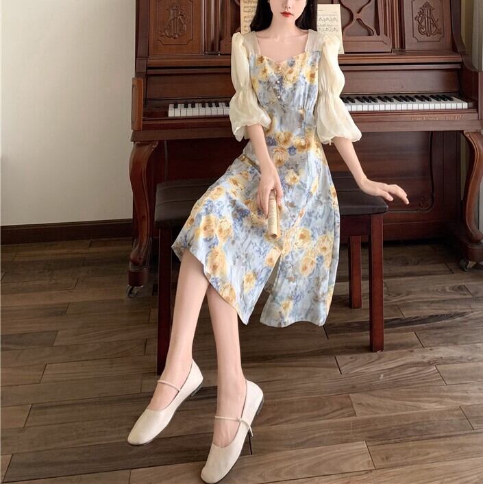 ワンピース ミディアム ミディ丈 花柄 フラワー プリント パフスリーブ ワンピ 切り替えし 切り替えデザイン 七分丈 シースルー スクエアネック シャーリング パーティー ドレス Aラインワンピース 夏 フレンチ パフスリーブドレス 女性 新デザイン センス ウエストスリミング ガール ふんわり ゆるかわ かわいい 大人可愛い 大人 大人女子 きれいめ おしゃれ お洒落 シンプル ラブリー キュート ガーリー 10代 20代 学生 デート お出かけ 女子会 休日 イベント こなれ感 ラフ ルーズ 抜け感