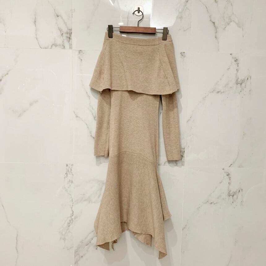 オフショル ワンピース ニット レディース 薄手ニット 長袖 ロングスリーブ アシメ襟 深めオフショル オープンショルダー フレアスカート ベージュ 単色 無地 秋 春 軽いニット 大人女子 大人可愛い エレガント 綺麗め 長め袖 韓国 韓国ファッション マーメイドワンピ ふんわり 優しい 女子度up デート 女子会 特別な日 旅行 リゾート ワンサイズ ナチュラルカラー 控えめ 清楚 大人 10代 20代 30代 低価格 値段重視 着回しやすい お買い得 きれいめカジュアル お出かけ着 格上げアイテム