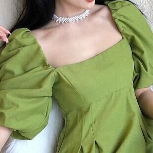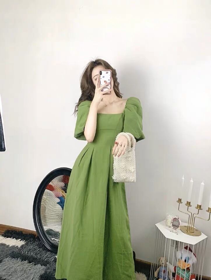 ワンピース ワンピ パフスリーブ モスグリーン ロング丈 シャーリング 大人 M L XL 2XL3XL 4XL スタイル スクエアネック パフ スリーブ ドレス プラスサイズ レディース フレンチ レトロ ウエスト スリミング ベルフラワー 半袖 婦人服 ストレート かわいい 大人可愛い きれいめ シンプル カジュアル 大人 上品 おしゃれ お洒落 大人可愛い 大人女子 こなれ感 モード系 20代 30代 デート 女子会 休日 パーティー 韓国 韓国系 オルチャン モテ 新作 定番 プチプラ トレンド