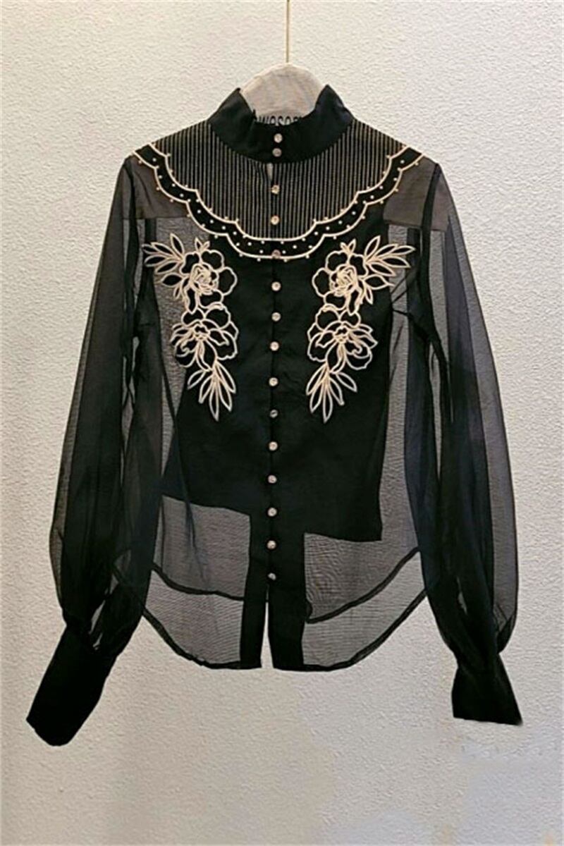 トップス レディース ブラウス 袖あり 長袖 スタンドカラー 刺繍 前開き 透け感 シースルー かわいい 大人可愛い きれいめ 大人 上品 おしゃれ かっこいい 大人女子 こなれ感 ラブリー キュート ガーリー セクシー エレガント ゆったり ホワイト ブラック 光沢 フラワー 花柄 春 二次会 披露宴 10代 20代 30代 OL 通勤 学生 通学 デート お出かけ 女子会 パーティー イベント リゾート 旅行 着回し 普段使い 韓国系 オルチャン ファッション コーデ スタイル モテ インスタ映え