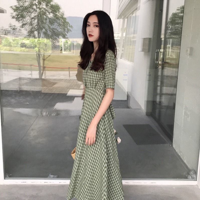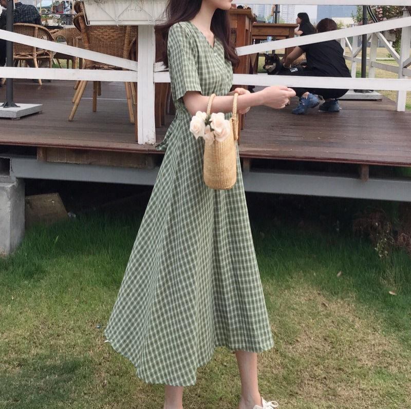 ワンピース レディース フレアワンピース ミモレ丈 ロング丈 袖あり 半袖 襟なし Vネック Aライン フレア バックリボン 綿 かわいい 大人可愛い きれいめ シンプル カジュアル 大人 上品 おしゃれ かっこいい 大人女子 こなれ感 ラブリー キュート ガーリー エレガント グリーン レッド チェック柄 格子柄 夏 10代 20代 30代 OL 通勤 学生 通学 デート お出かけ 女子会 リゾート 旅行 着回し 普段使い 韓国系 オルチャン ファッション コーデ スタイル モテ 体系カバー 美脚 脚長