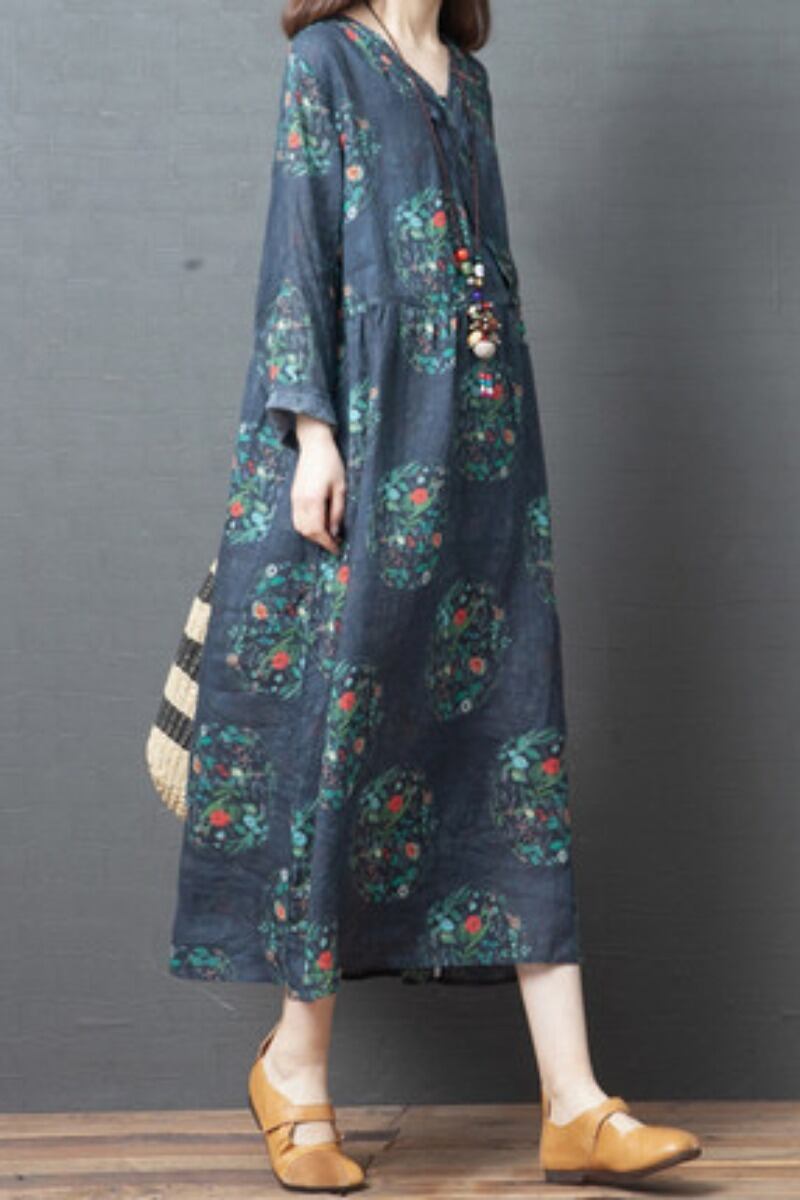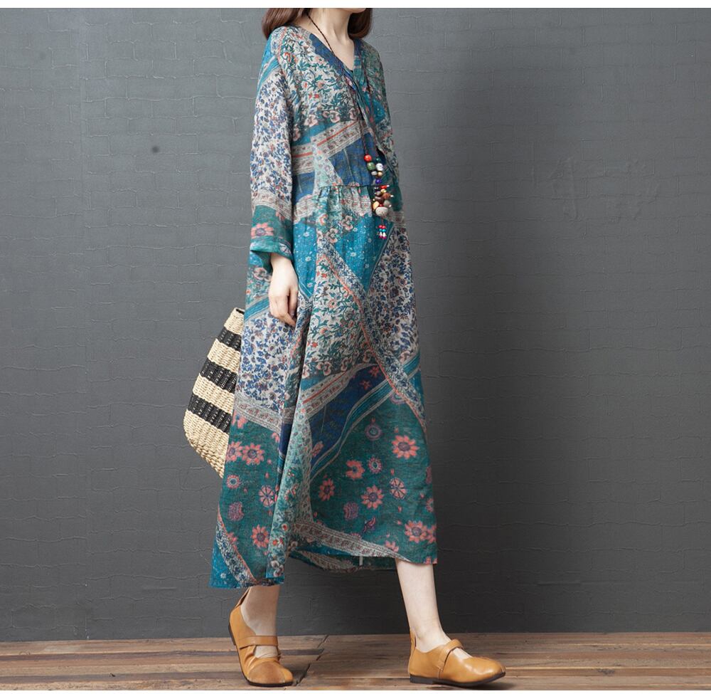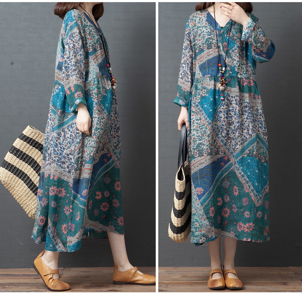 ミドル丈ワンピース ビッグサイズ ビッグシルエット レディース ラフ ゆるシルエット 大きいサイズ 全4サイズ M L XL XXL 全2色 ネイビー 紺色 ライトブルー 明るい青 Vネック 春 夏 秋 ミドル丈 ミモレ丈 重ね着 アジアンテイスト おしゃれ お洒落 大人女子 大人可愛い 普段着 普段遣い ルーズ 楽ちん 体型カバー 通勤 通学 オフィス お出かけ デート 公園デビュー 休日 10代 20代 30代 40代 50代 カジュアル 長袖 可愛い 韓国 カワイイ プリント エキゾチック 個性的