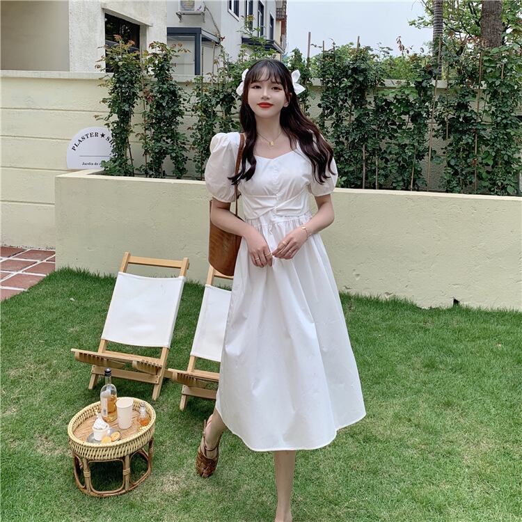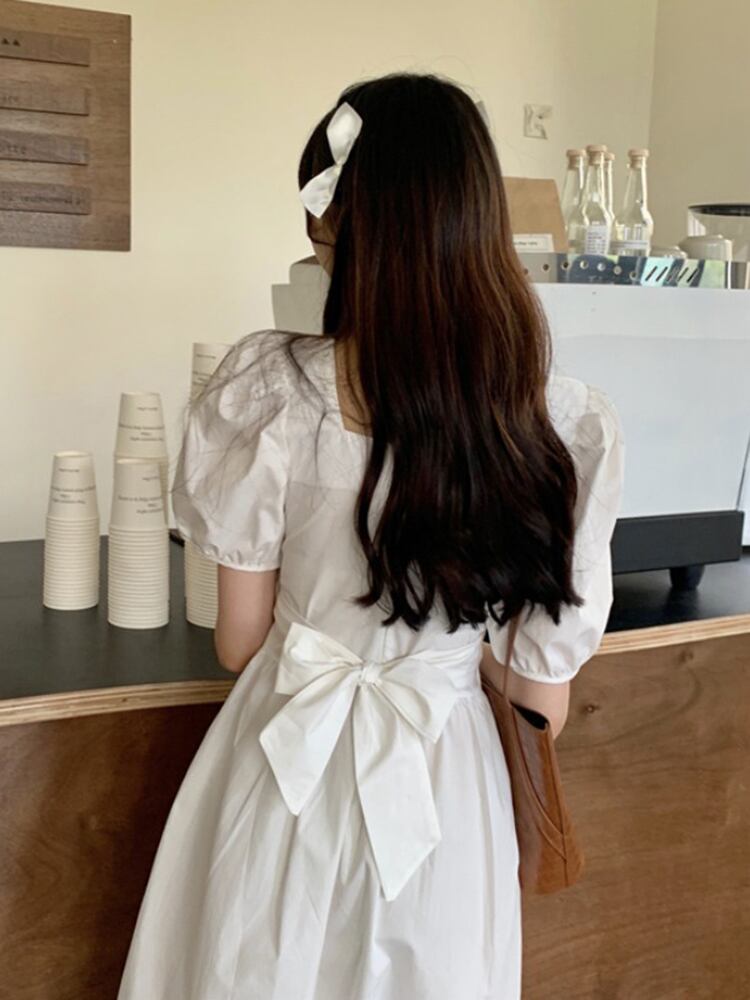 ワンピース レディース 膝丈 ひざ丈 袖あり 半袖 パフスリーブ バブルスリーブ スクエアネック 襟なし シャーリング ギャザー 青 ブルー ライトブルー 白 ホワイト ふんわり リボン ウエストマーク ウエストリボン バックリボン ハイウエスト 透け感 かわいい 大人可愛い 大人 大人女子 きれいめ おしゃれ お洒落 シンプル ラブリー キュート ガーリー 10代 20代 30代 学生 通学 デート お出かけ 女子会 休日 イベント 普段使い カジュアル こなれ感 抜け感 上品 エレガント パーティー