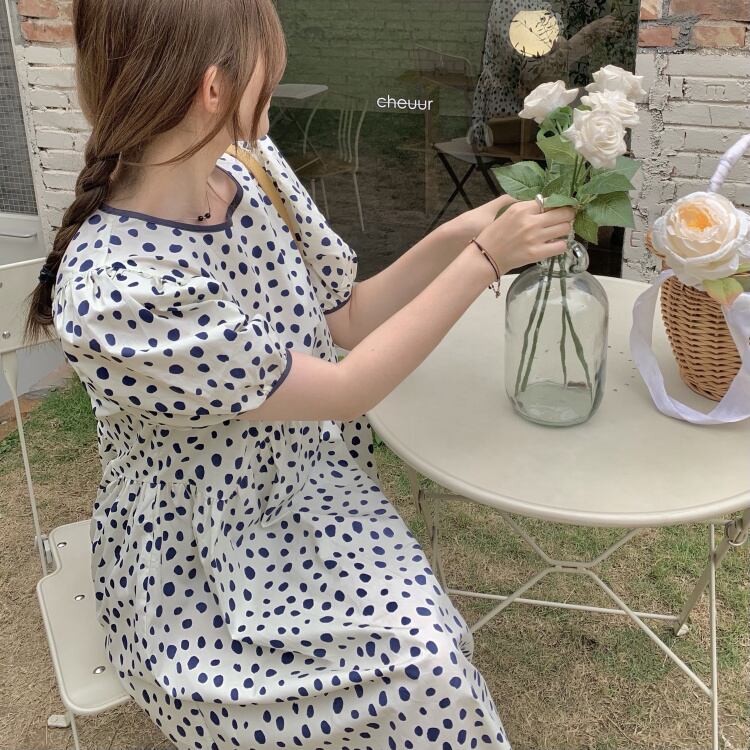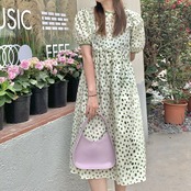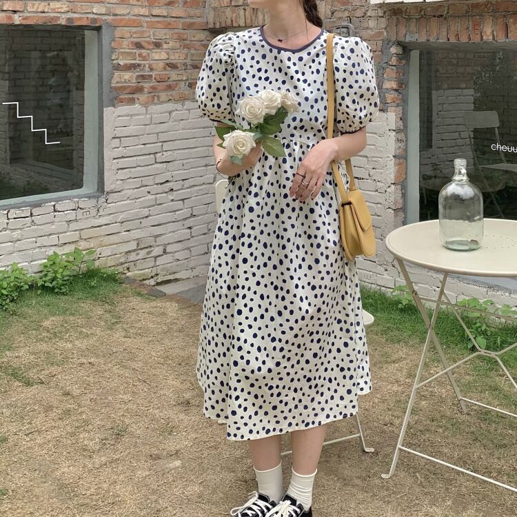 ワンピース パフスリーブ ロング Aワンピ リボン シャーリン グ 大人綺麗 グリーン ネイビー ドット柄 水玉 ロング ミディアム丈 ミディ 体型カバー 新しい 韓国 ルーズ 妊婦 大き目 ゆったり ゆるかわ ビッグサイズ 薄い ミドル丈スカート 半袖 優しい フレンチドレス ゆるシルエット 重ね着 着回し おしゃれ お洒落 大人女子 大人可愛い 普段着 普段遣い ルーズ 楽ちん お出かけ デート 休日 10代 20代 30代 カジュアル 可愛い 韓国 韓国風 オルチャン カワイイ プリント 個性的