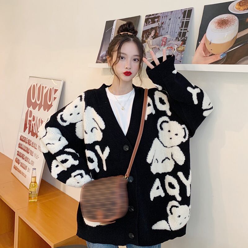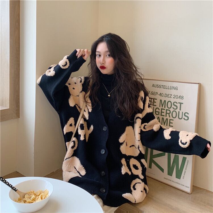 トップス カーディガン 黒 ブラック 白 ホワイト アプリコット モノトーン アニマル くま クマ かわいい 人気商品 上着 袖あり 長袖 萌袖 Vネック 襟なし ボタン ボタンダウン 前開き 厚手 大人可愛い 大人 大人女子 きれいめ おしゃれ お洒落 シンプル ラブリー キュート ガーリー フェミニン 10代 20代 30代 学生 通学 デート お出かけ 女子会 休日 普段使い パーティー イベント カジュアル 防寒 暖かい あったか 部屋着 大きめ こなれ感 ラフ ルーズ 抜け感 ゆったり ゆる