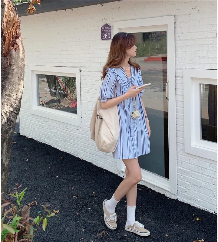 ワンピース レディース シャツワンピース ミニ丈 ミニ ショート丈 ショート 袖あり 半袖 パフスリーブ 襟付き ビッグカラー ストレート ワイド ストライプ 青 ブルー 白 ホワイト かわいい 大人可愛い 大人 大人女子 きれいめ おしゃれ お洒落 シンプル ラブリー キュート ガーリー 10代 20代 30代 学生 通学 デート お出かけ 女子会 休日 イベント 普段使い カジュアル こなれ感 ラフ ルーズ 抜け感 ゆったり ゆる 大きめ 体型カバー イベント リゾート 旅行 海 プール モテ 夏