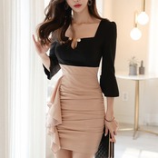 タイトワンピース タイト スカート フリル 切り替えし デザイン フリル七分丈 前開き ブラック アプリコット シャーリング スリット 秋 冬 新作 韓国 オルチャン ファッション 海外 ネット 流行 女性 OL スクエアカラー フェイクツーピース ヒップフォールド フリルワンピース スタイル モテ 美脚 新作 トレンド 流行 インスタ映え S M L XL パーティー ドレス イベント OL 通勤 大人クール 大人かわいい 清楚 メンズライク 合コン 二次会 披露宴 旅行 リゾート ディナー 旅行