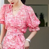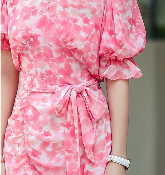 パフスリーブワンピース フラワー プリント 花柄 ピンク ロング丈 ロング ファンスーツ フレンチ パフスリーブ シフォン シャツ ハイウエスト レギュラー ハーフスカート フローラル マーメイドドレス Vネックウエストリボン調節 シャーリングデザイン ダブルブレスト ヒップドレス S M L XL 替えデザイン かわいい 大人可愛い きれいめ 大人 おしゃれ お洒落 大人可愛い 大人女子 こなれ感 個性的 とろみ感 抜け感 人気 ビジネス OL デート お出かけ オルチャン コーデ モテ トレンド