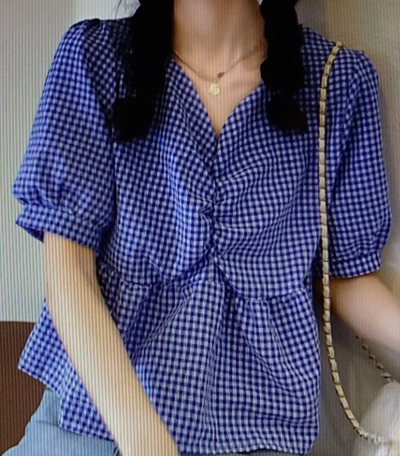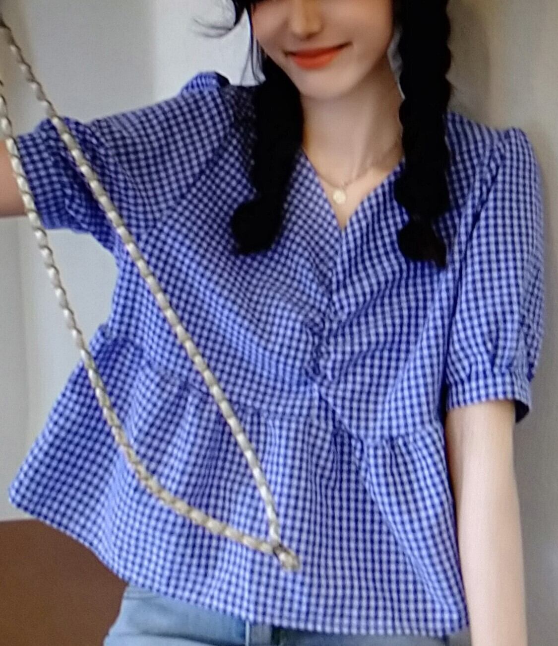 ギンガムチェックのハイウエストブラウス。
