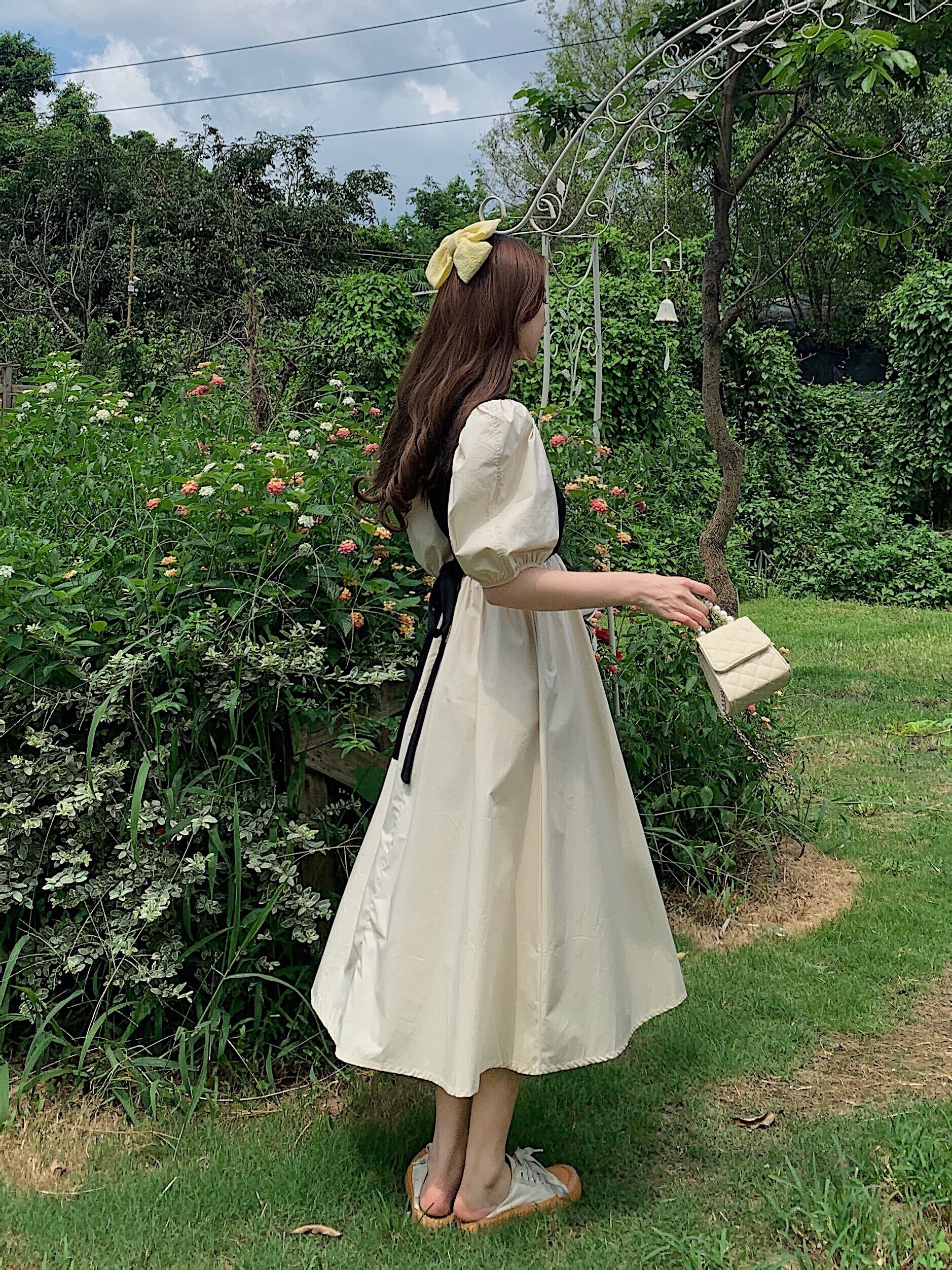 ワンピース レディース ロングスカート フレアスカート フェイクワンピース ロング丈 ロング 袖あり 半袖 パフスリーブ Vネック プランジングネック Aライン 切り替えデザイン ギャザー ウエストマーク バックリボン 異素材MIX 無地 白 ホワイト オレンジ レトロ エキゾチック かわいい 大人可愛い 大人 大人女子 きれいめ おしゃれ お洒落 シンプル ラブリー キュート ガーリー 10代 20代 学生 デート お出かけ 女子会 休日 イベント 普段使い カジュアル こなれ感 上品 エレガント