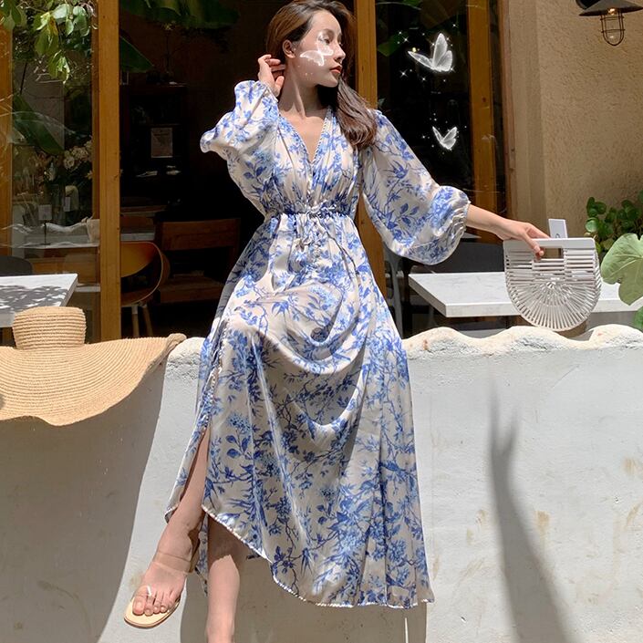 ワンピース レディース ワンピドレス ロングスカート フレアスカート ロング丈 ロング 袖あり 7分袖 七分袖 ボリューム袖 Vネック ギャザー 襟なし シフォン ウエストマーク ウエストリボン リボン ボタン ボタンダウン 青 ブルー 透け感 花柄 フラワー ボタニカル 夏 とろみ感 かわいい 大人可愛い 大人 大人女子 きれいめ おしゃれ お洒落 シンプル ラブリー キュート ガーリー 10代 20代 30代 学生 デート お出かけ 女子会 休日 イベント カジュアル 抜け感 上品 エレガント