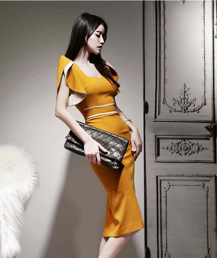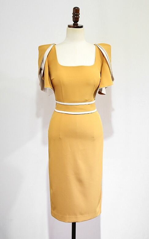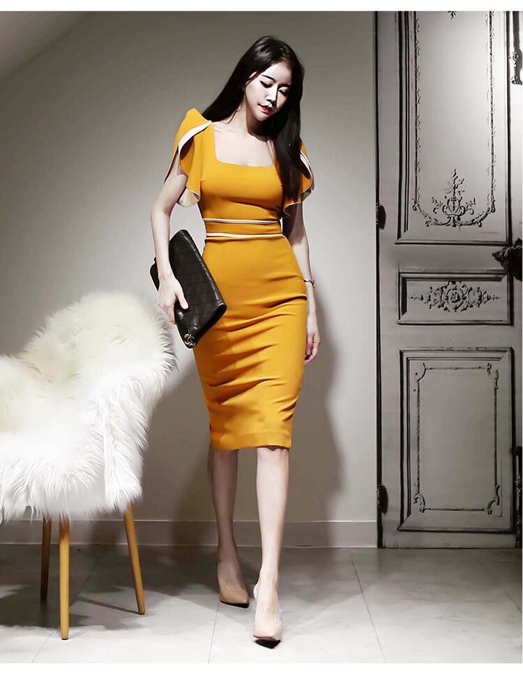 ワンピース レディース タイトワンピース 膝丈 ミモレ丈 袖あり 半袖 萌袖 スクエアネック 襟なし スリム タイト 細身 Iライン ウエストマーク フリル ハイウエスト ファスナー かわいい 大人可愛い きれいめ 大人 上品 おしゃれ かっこいい 大人女子 こなれ感 セクシー エレガント イエロー 無地 結婚式 二次会 披露宴 20代 30代 OL 通勤 学生 通学 デート お出かけ パーティー イベント 韓国系 オルチャン ファッション コーデ スタイル モテ 体系カバー 美脚 脚長 インスタ映え