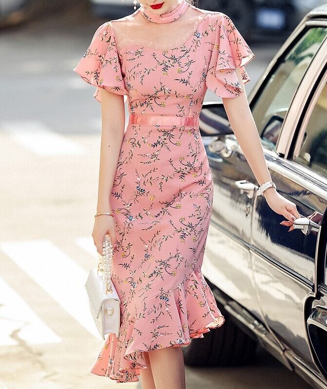 マーメイドドレス パーティー ワンピース スカート ポップス 20代 30代 40代 セクシーワンピ アダルトドレス マーメイドワンピ ピンクドレス ネックチョッカー風 レディースドレス 女性用 半袖 フレアスリーブ 夏ワンピ ホームパーティー リゾート 半袖マーメイドワンピ 半袖ドレス サマードレス フローラルピンク マーメイドフリル サマーフリルドレス ハイウエストピンクドレス 柄物ワンピ 前あがりフリル チョッカーレース タイトワンピ ひざ下 フリルドレス デート ディナー チュウリップスカート