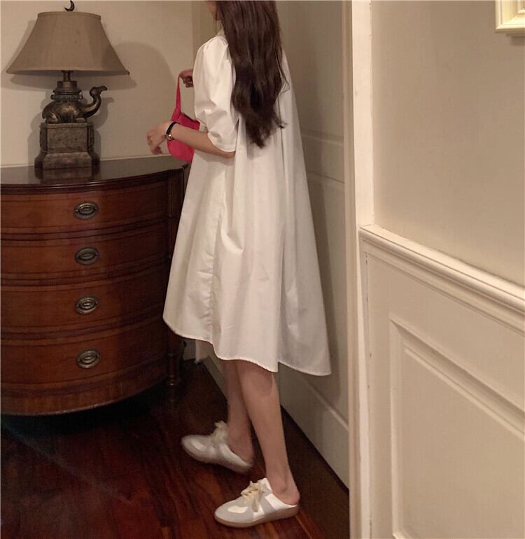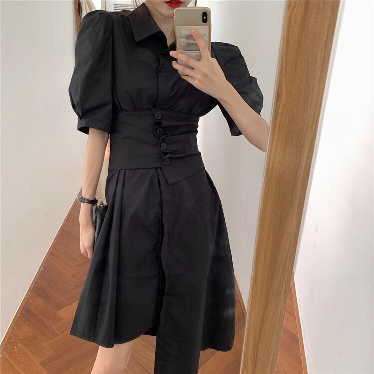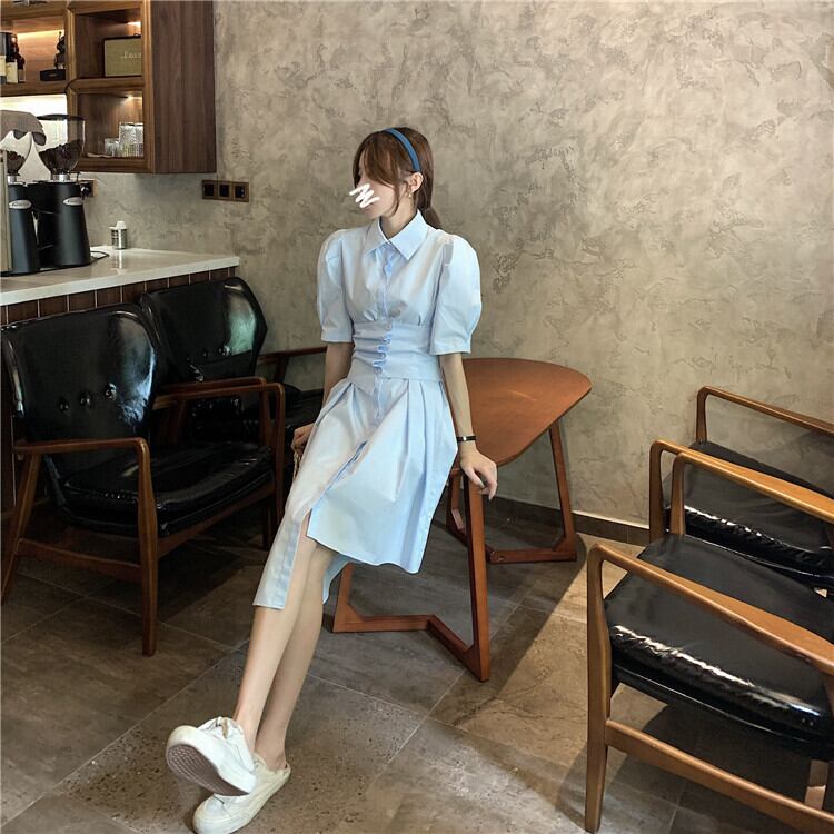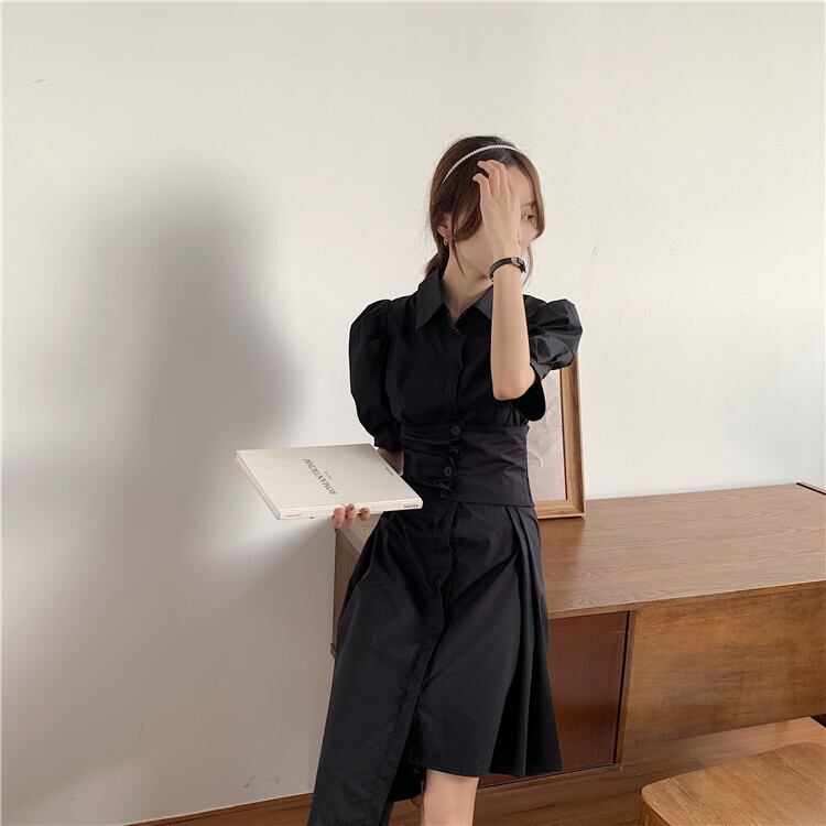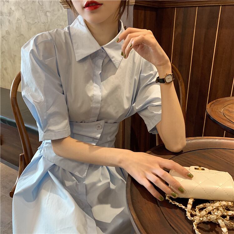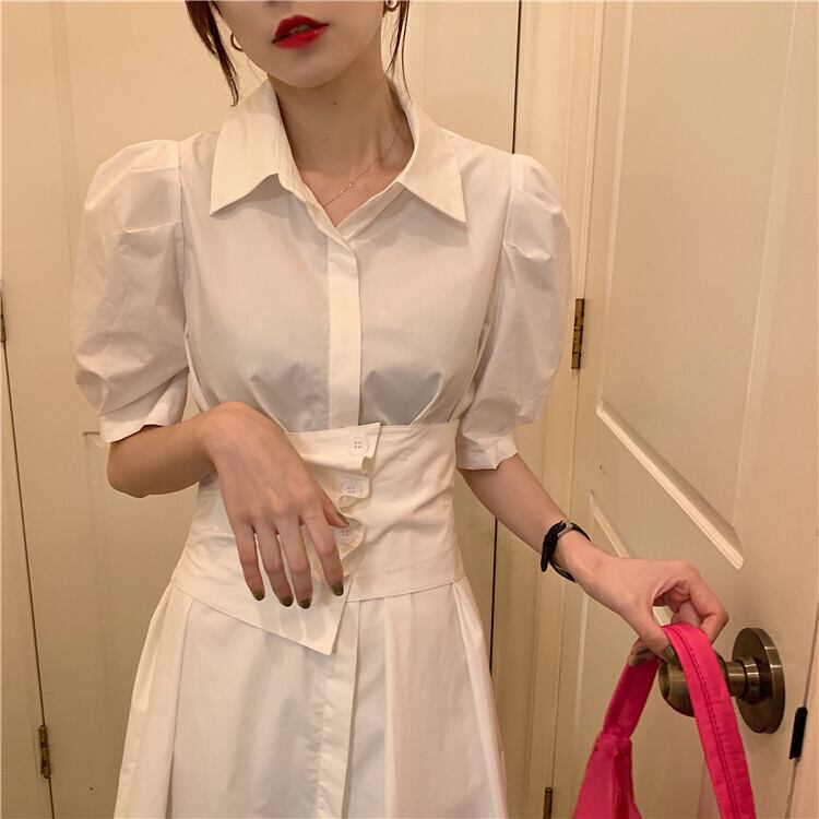 ワンピース シャツワンピ パフスリーブ 襟付き ホワイト 白 ブルー 水色 ブラック 黒 レディース ワンサイズ 可愛い かわいい シンプル こなれ感 主役級 個性的 春 夏 秋 10代 20代 30代 40代 50代 通勤 通学 学生 休日 イベント 大人女子 大人かわいい 韓国風 オルチャン 女子会 ラブリー キュート ガーリー 無地 デート お出かけ モテ インスタ映え 普段着 お洒落 オシャレ 双子 色違い ゆったり ラフ ルーズ アシンメトリー ウエストベルト ボタン 2WAY 半袖 5分丈