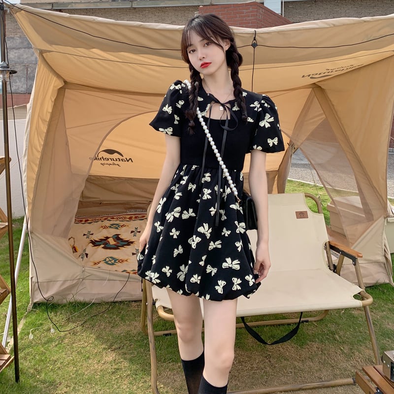 ワンピース パフスリーブ バルーンスカート ホワイト 白 ブラック 黒 レディース ワンサイズ 可愛い かわいい こなれ感 主役級 個性的 春 夏 秋 10代 20代 30代 40代 学生 休日 イベント 大人女子 大人かわいい 韓国風 韓国 オルチャン 女子会 ラブリー キュート ガーリー デート お出かけ モテ インスタ映え 普段着 お洒落 オシャレ 双子 色違い 半袖 リボン柄 胸元リボン セクシー ミニ丈 膝上 パーティー ライブ 参戦服 遊園地 モノトーン 切り替えデザイン お揃い 二の腕カバー