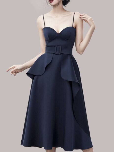 ストラップドレス ミッドスカート丈 イブニングドレス 10代 20代 30代 ノースリーブ ワンピース ナイトドレス パーティー デート ディナー ダークネイビー ハイウエスト ベルト付き ダークブルー スカート ワンピース ノースリーブワンピ ゆるやかフリル キュート チャーミング 後jジッパー ハイウエストフリルスカート 無地 サイズS M L XL ランチパーティー カクテルパーティー ダークブルー無地 切り替えフレア サマードレス ノースリーブ夏ドレス 夏ワンピース ベルト無地ワンピース