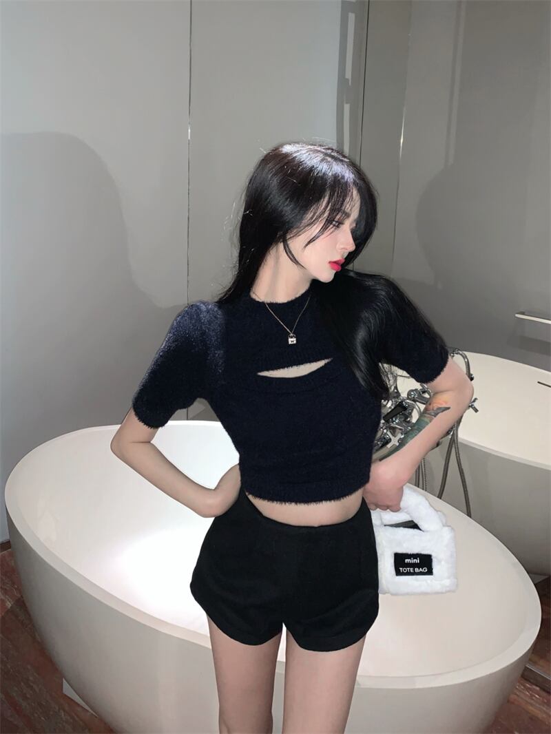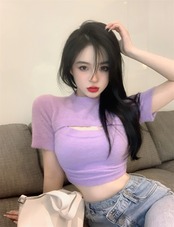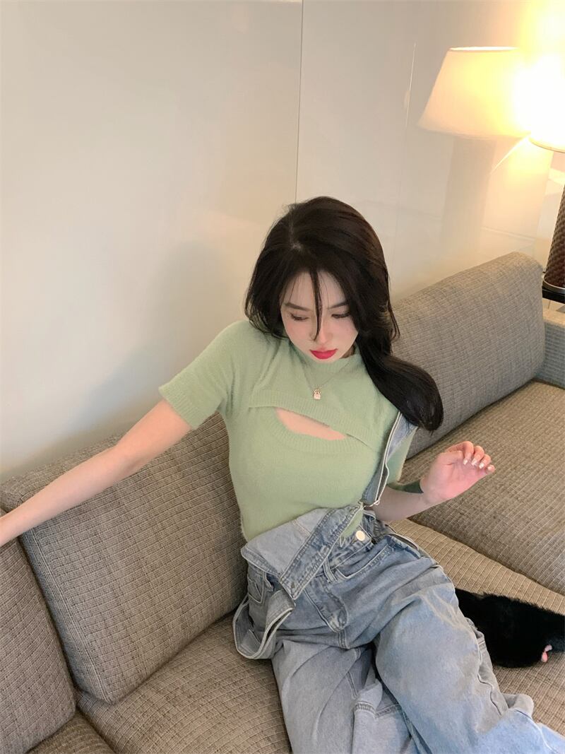トップス ニット へそ出し 白 ホワイト 紫 パープル 緑 グリーン 黒 ブラック 半袖 トレンド トレンディハイネック ふわふわ フロントカットアウト フロントオープン かわいい 大人可愛い 大人 大人女子 きれいめ おしゃれ お洒落 インパクト シンプル ラブリー キュート ガーリー フェミニン 10代 20代 学生 通学 デート お出かけ 女子会 休日 普段使い カジュアル スリム タイト こなれ感 ラフ ルーズ 穴あき インスタ映え モテ 着回し 抜け感 ゆる セクシー パーティー イベント