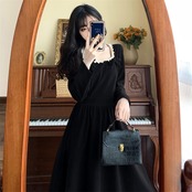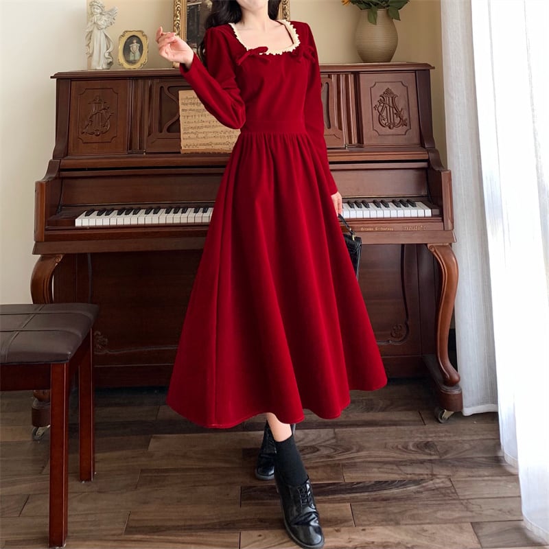 レッドカラーブラック ロングワンピースドレス ワンピース ロング丈 お出かけ 新作 長袖 スクエアネック フレア Aライン リボン ベルベット かわいい 大人可愛い きれいめ 大人 上品 おしゃれ かっこいい レトロ 大人可愛い 大人女子 ラブリー キュート 主役級 存在感 フォーマル 無地 秋 冬 誕生日 結婚式 二次会 披露宴 冠婚葬祭 ハロウィン クリスマス バレンタイン 10代 20代 30代 40代 レディース ママ 女の子 お出かけ パーティー イベント コーデ スタイル モテ プレゼント