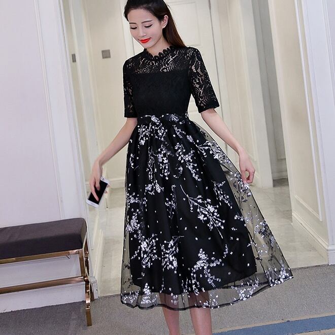 ワンピース レディース フレアワンピース ワンピドレス 膝丈 ひざ丈 袖あり 半袖 クルーネック フレア セミフレア Aライン 裾フレア レース 刺繍 シフォン 透け感 シースルー 伸縮性 黒 ブラック 赤 レッド 柄 夏 20代 30代 デート お出かけ 女子会 休日 パーティー イベント 着回し 普段使い 韓国 韓国系 オルチャン ファッション コーデ スタイル 楽ちん モテ 美脚 脚長 プレゼント ギフト 新作 定番 プチプラ トレンド 流行 インスタ映え