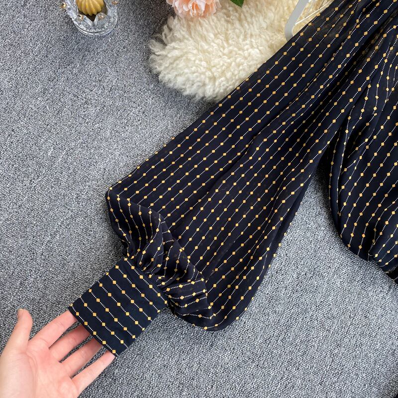 ドット柄ブラウス シースルー 襟付き 長袖 レディース 透け感 ブラック カフス 黄色ドット 水玉 シャツ 黒シャツ 前ボタン 前開き カフスボタン 上品 トレンドスタイル 春秋 清楚 カジュアル オフィスカジュアル しっとり 落ち感 長め丈 サイズ豊富 バルーン袖 通勤 通学 デート 休日カジュアル 幼稚園送迎 お買い物 お出かけ お食事 簡単コーデ 着やすい レトロ感 かわいい 大人可愛い 大人女子 韓国 韓国ファッション 低価格 低予算 値段重視 高コスパ ヘビロテ服 10代 20代 30代