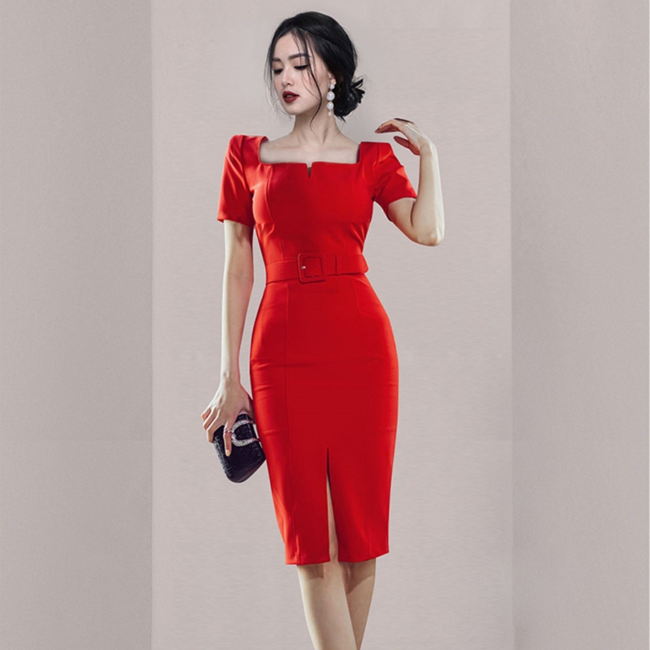 ワンピース レディース フォーマルドレス 半袖 バブルスリーブ スクエアネック ウエストマーク ベルト 膝丈 ミディアム丈 タイト バックファスナー 大人可愛い きれいめ 上品 シンプル 大人 おしゃれ かっこいい レトロ クラシカル こなれ感 クール セクシー フォーマル 存在感 4サイズ S M L XL レッド 無地 春 夏 10代 20代 OL デート お出かけ 休日 パーティー イベント 結婚式 二次会 謝恩会 誕生日 韓国系 オルチャン ファッション コーデ スタイル 楽ちん 美脚 脚長 流行