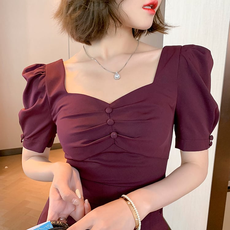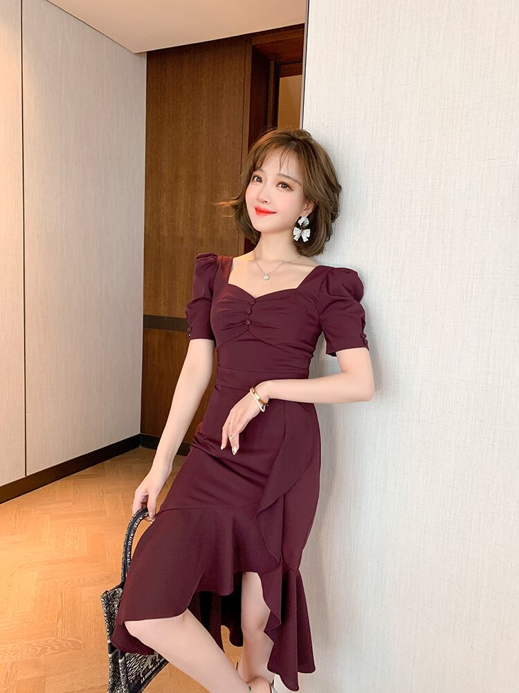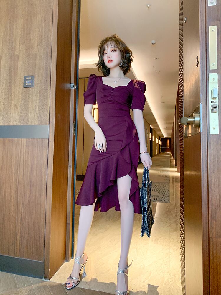 ドレスワンピ レディース ファスナー ワンピース タイトスカート ひざ丈 膝丈 袖あり 半袖 パフスリーブ スクエアネック 襟なし スリム タイト 細身 ペプラム ギャザー ボタン スリット 切り替えデザイン 紫 ダークパープル パープル かわいい 大人可愛い 大人 大人女子 きれいめ おしゃれ お洒落 シンプル ラブリー キュート 10代 20代 30代 学生 通学 デート お出かけ 女子会 休日 イベント こなれ感 抜け感 上品 エレガント セクシー フォーマル 結婚式 二次会 披露宴 パーティー