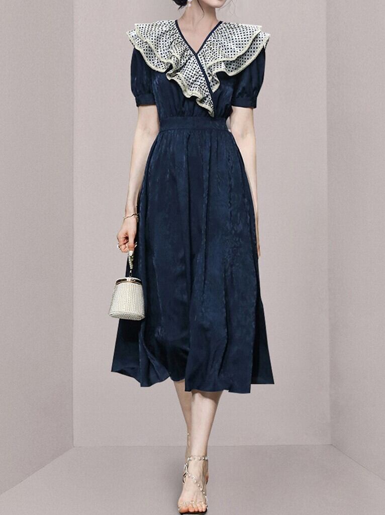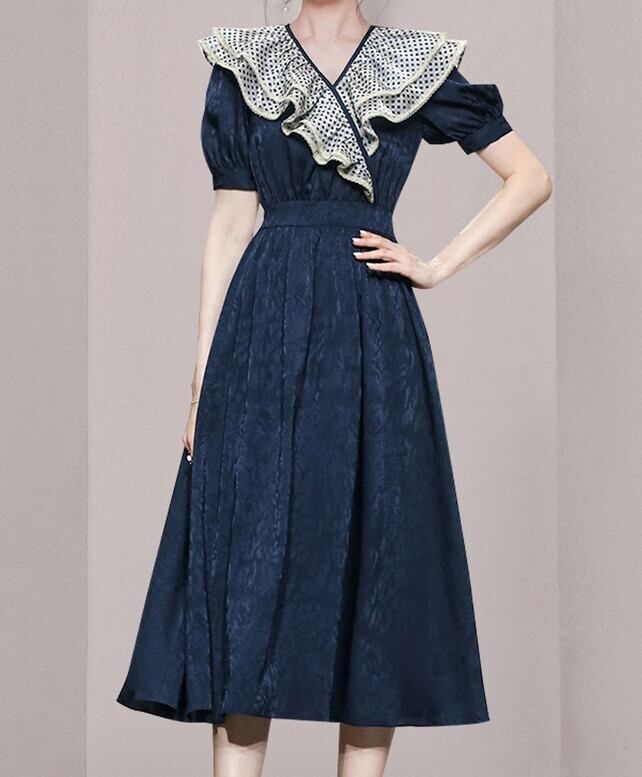 水玉フリルドレス Vカット襟 Wフリルエリ 無地時柄 ボタニカル ネービー 20代 30代 パフスリーブ サマードレス スカート ドット ダークブルー パーティー デート 無地ワンピ 夏服 サマードットフリルドレス ホームパーティー サマーパフスリーブワンピース ブイネック 水玉ダブルフリル フリルワンピース 水玉ワンピース フレンチスカート 提灯袖 買い物 ディナー ドットサマーワンピ 地柄 無地ドレス 夏襟フリル サマーフリルハイウエスト フレンチ 半袖 サマー 夏 水玉 フリル 夏ダークブルーワンピ