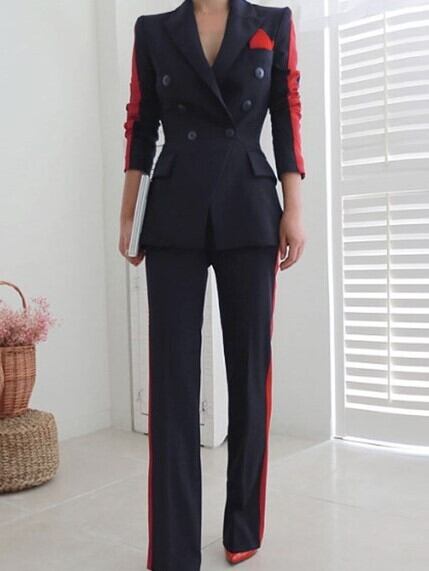 パンツスーツ カジュアル コントラストスーツ 赤ライン パンツ ブレザー 20代 30代 スラックス ボトムス 上着 コート 黒スラックス セットアップ カジュアルスーツ パンツセット レットライン パンタロン スラックススーツ ブラックスーツ ダブルブレザー Wボタン ジャケット ホームパーティー 通勤 リゾート 買い物 デート カジュアルジャケットスーツ スーツ パンツ ボトムススーツ ダブルブレザー 7分袖ジャケット 美脚スラックス スリムブレザー スリムジャケット ライン入りパンツ ツートンスーツ