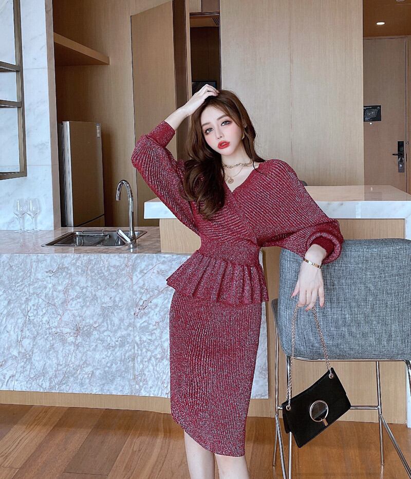 セットアップ レディース ニットスカート ペプラムトップス ひざ丈 膝丈 袖あり 長袖 ボリューム袖 Vネック 襟なし ギャザー ウエストマーク 無地 カラバリ豊富 カーキ 緑 グリーン 青 ブルー ピンク 赤 ワインレッド 黒 ブラック 茶色 ライトブラウン かわいい 大人可愛い 大人 大人女子 きれいめ おしゃれ お洒落 シンプル ラブリー キュート ガーリー 学生 通学 デート お出かけ 女子会 休日 イベント 普段使い カジュアル こなれ感 抜け感 上品 エレガント セクシー パーティー