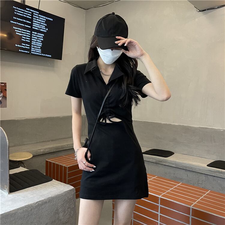ワンピース シャツワンピ 襟付き Vネック ブラック 黒 レディース ミニスカート 腹チラ セクシー 腹見え 韓国 韓国風 オルチャン レースアップ ギャザー タイト 無地 リボン ミニ ハイウエスト 膝上 ショート丈 春 夏 秋 ファッション 海外 美脚 かわいい 大人可愛い きれいめ シンプル おしゃれ かっこいい 大人女子 こなれ感 10代 20代 30代 40代 通学 デート 女子会 イベント 旅行 普段使い お出かけ ロック 編み上げ 脚長 インスタ映え 主役級 個性的 クール スポーティー