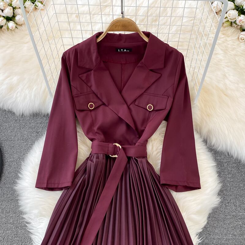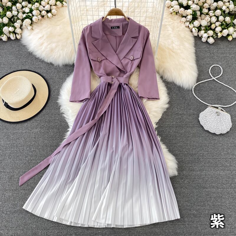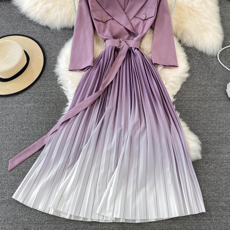 ワンピース レディース アコーディオンプリーツ ロングスカート プリーツスカート アコーディオンプリーツ ロング丈 袖あり 7分袖 七分袖 襟付き ノッチドラペル ウエストマーク ベルト ボタン グラデーション スーツ オレンジ フクシア 紫 パープル 黄色 イエロー 青 ブルー 黒 ブラック かわいい 大人可愛い 大人 大人女子 きれいめ おしゃれ お洒落 華やか インパクト フェミニン 10代 20代 30代 通勤 学生 通学 デート 普段使い 上品 エレガント 結婚式 二次会 披露宴 パーティー