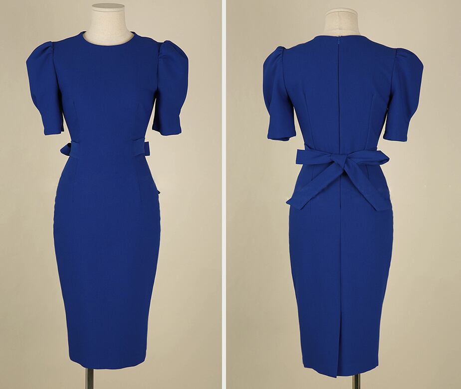 ワンピース レディース タイトスカート ワンピドレス 膝丈 ひざ丈 袖あり 半袖 パフスリーブ バルーンスリーブ Uネック ラウンドネック 襟なし スリム タイト 細身 ストレート ウエストマーク ウエストリボン バックリボン リボン スリット バックスリット ファスナー 青 ブルー かわいい 大人可愛い 大人 大人女子 きれいめ おしゃれ お洒落 シンプル ラブリー キュート ガーリー 10代 20代 30代 学生 デート お出かけ イベント 上品 エレガント 結婚式 二次会 披露宴 パーティー