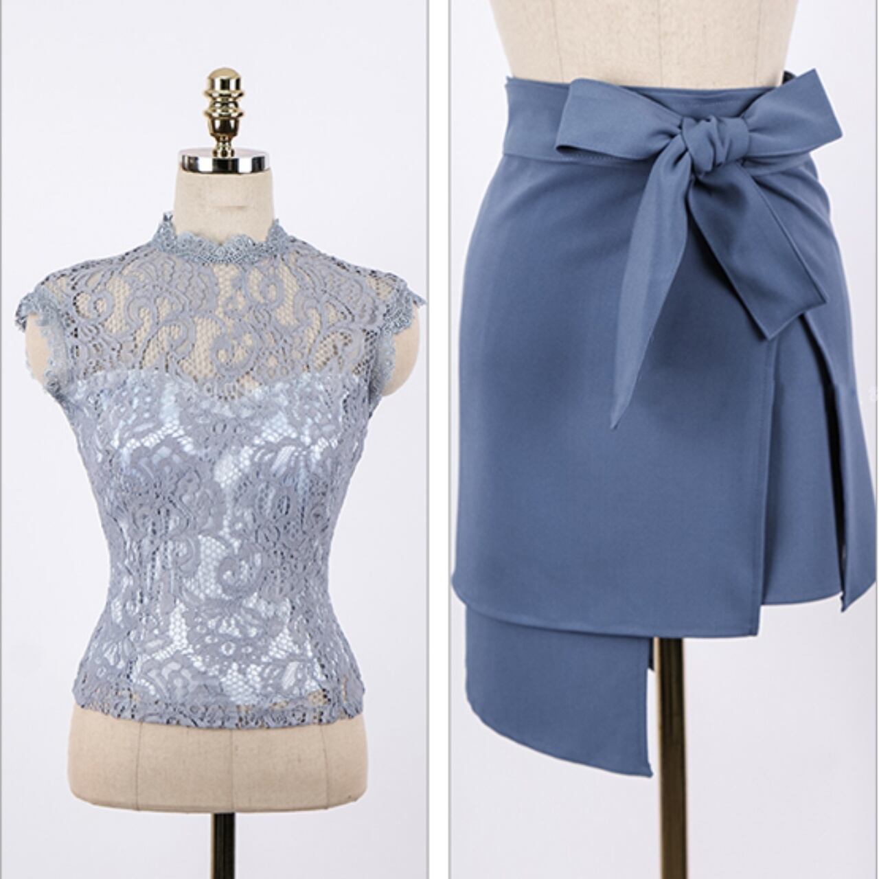 セットアップ レディース ブラウス レース ノースリーブ ハイネック バックファスナー スカート ラップスカート風 ウエストリボン 膝上 ショート丈 ミニ丈 無地 大人可愛い かわいい きれいめ シンプル 大人女子 フェミニン キュート セクシー エレガント フォーマル 4サイズ ブルー 大人カラー 10代 20代 オフィス OL デート お出かけ デート 女子会 食事会 休日 パーティー イベント 着回し 普段使い 韓国系 オルチャン ファッション コーデ スタイル 楽ちん 簡単コーデ 美脚 脚長 モテ