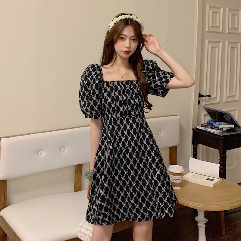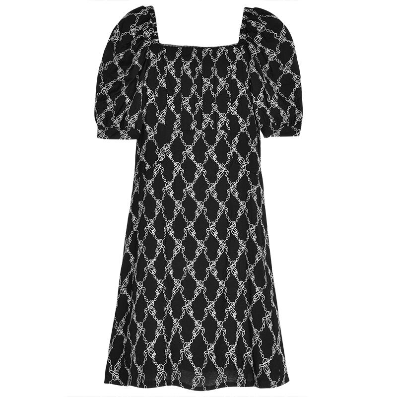 ワンピース 柄 スクエアネック パフスリーブ ブラック 黒 レディース 全2サイズ S M Aラインスカート レトロ 膝上 ミニスカート ハイウエスト ショート丈 韓国 韓国風 オルチャン ファッション 海外 美脚 膝丈 ひざ丈 膝上 タイト かわいい 大人可愛い きれいめ シンプル おしゃれ かっこいい 大人女子 こなれ感 ラブリー キュート ガーリー エレガント 10代 20代 30代 40代 50代 デート お出かけ 女子会 イベント 普段使い パーティー ドレス 結婚式 二次会 半袖 5分丈 刺繍