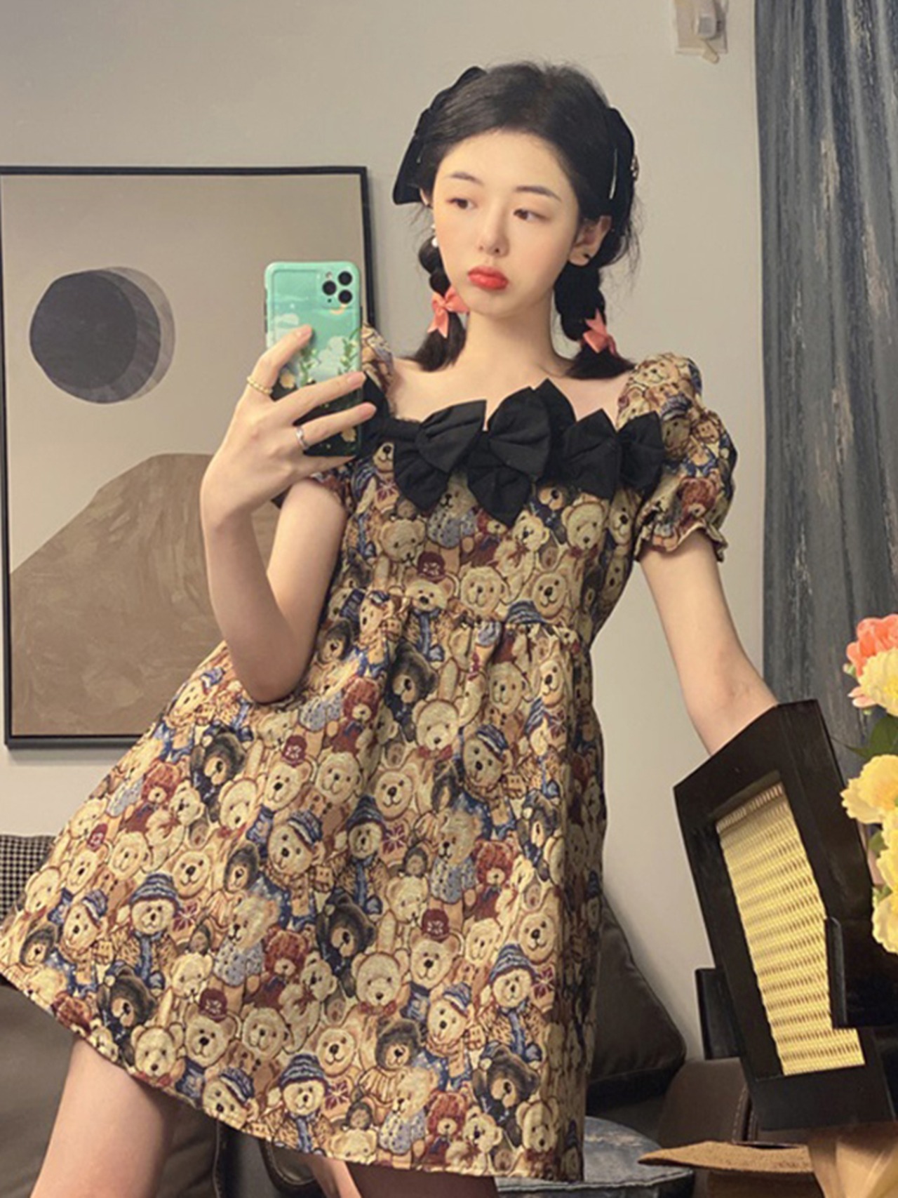 原宿系 クマ柄 ベアー 総柄 Aライン ワンピース ドレス パフスリーブ 膝上 個性的 ロリータ 可憐 レディース 全3サイズ S M L パーティー 外国風 韓国 韓国風 オルチャン おしゃれ お洒落 可愛い キュート ガーリー 10代 20代 30代 イベント 主役級 存在感 美脚 脚長 インスタ映え 誕生日 スクエアネック お出かけ デート 胸元リボン ビッグリボン ハイウエスト フリル リボンベルト お出かけ 休日 女子会 キャラクター レトロ ラブリー 半袖 ミニ丈 ミニスカート ライブ 参戦服