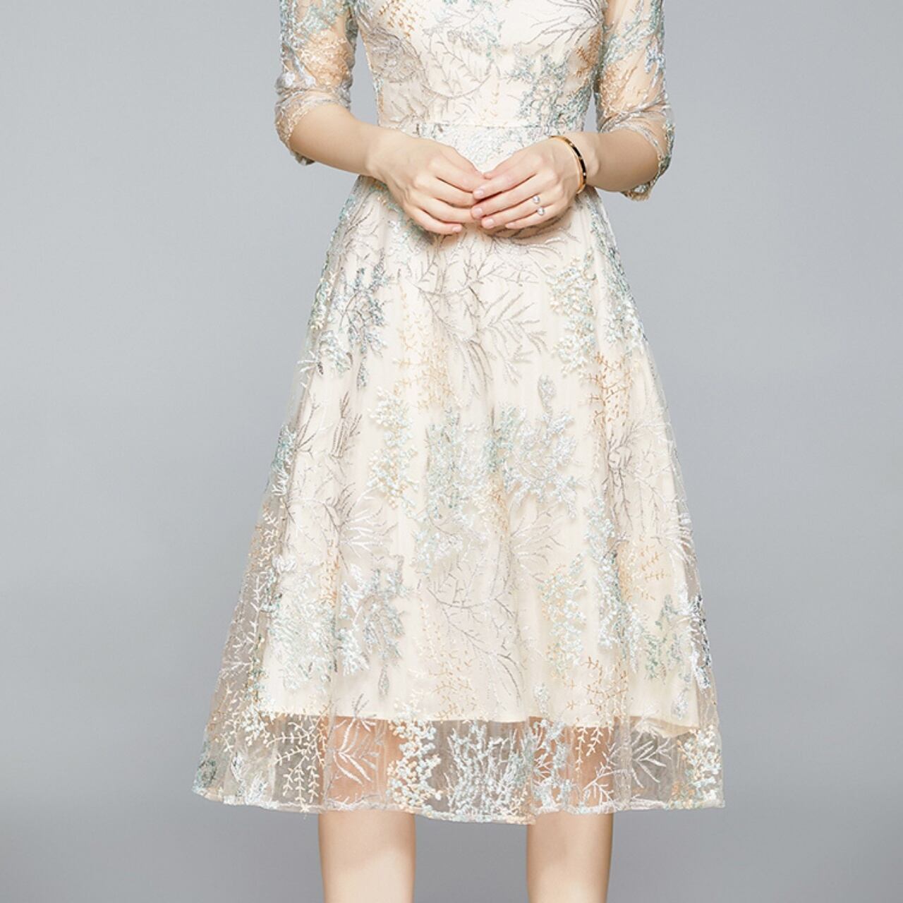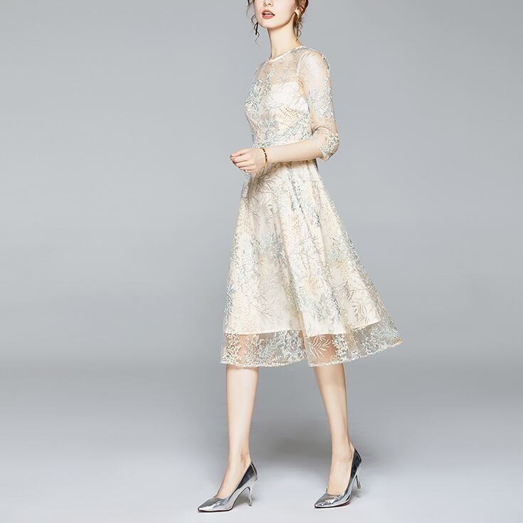 ワンピース レディース フォーマルドレス 刺繍 袖あり 6分袖 クルーネック 膝下 ミモレ丈 バックファスナー ウエスト切替 大人可愛い かわいい きれいめ シンプル 大人 上品 お洒落 かっこいい こなれ感 キュート セクシー エレガント フォーマル 抜け感 存在感 主役級 サイズ豊富 5サイズ 小さいサイズ 大きいサイズ ホワイト 柄 セレモニー 結婚式 二次会 謝恩会 10代 20代 学生 OL お出かけ 休日 女子会 パーティー イベント 韓国系 オルチャン ファッション コーデ スタイル モテ