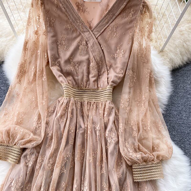 ドレス カーキ 枯れ草色 結婚式 レディース ひざ丈 膝丈 メッシュレース ミドル丈 ミモレ丈 全4サイズ S M L XL パーティー エレガント フォーマル オールシーズン 韓国 韓国風 きれいめ 大人 上品 おしゃれ 大人可愛い 大人女子 10代 20代 30代 40代 50代 60代 イベント 主役級 存在感 二次会 謝恩会 長袖 シーズンレス 誕生日 披露宴 美脚 脚長 インスタ映え ラグジュアリー セレブ Vネック パフスリーブ ヌン活 アフタヌーンティー 外国風