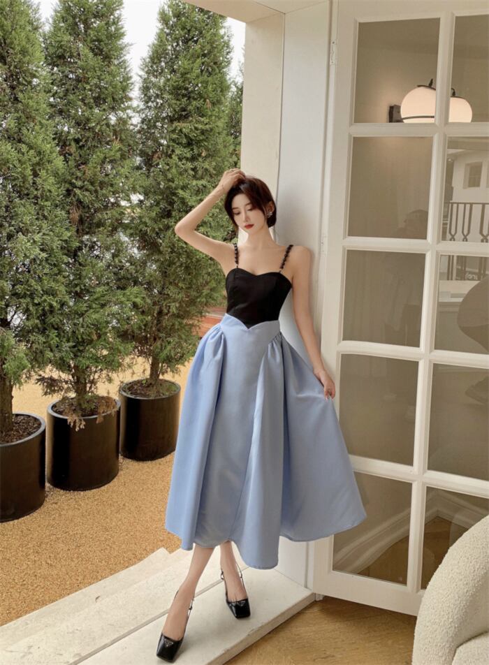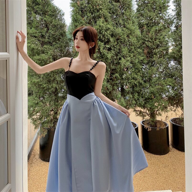 ワンピース 水色ドレス キャミワンピース フレアスカート ロングスカート ロング丈 袖なし ノースリーブ 光沢 ブラックパール ドッキング ツートンカラー 黒 ブラック 青 ブルー ボリューム かわいい 大人可愛い 大人 大人女子 きれいめ おしゃれ お洒落 シンプル ラブリー キュート ガーリー フェミニン 10代 20代 学生 通学 デート お出かけ 女子会 休日 普段使い カジュアル インパクト こなれ感 ルーズ 抜け感 セクシー 二次会 披露宴 パーティー イベント リゾート 海 プール 夏