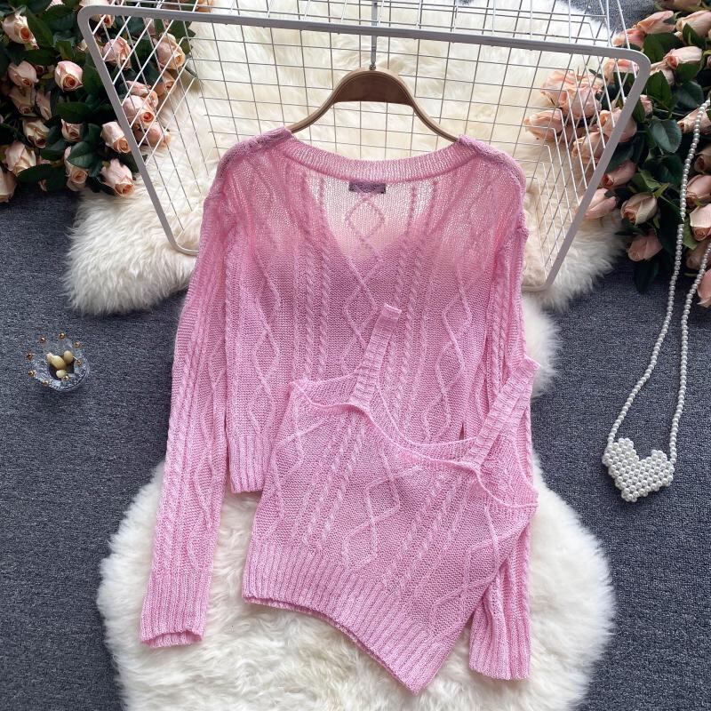 トップス レディース 2点セット カーディガン キャミソール ショート丈 前開き 袖あり Vネック 襟無し ニット ケーブルニット スリム 細身 かわいい 大人可愛い きれいめ 大人 上品 おしゃれ 大人女子 こなれ感 セクシー エレガント 10代 20代 30代 OL 通勤 学生 通学 デート お出かけ 女子会 パーティー イベント リゾート 着回し 普段使い 重ね着 韓国系 オルチャン ファッション コーデ スタイル 楽ちん モテ インスタ映え ピンク ブラック ブルー ブラウン ホワイト