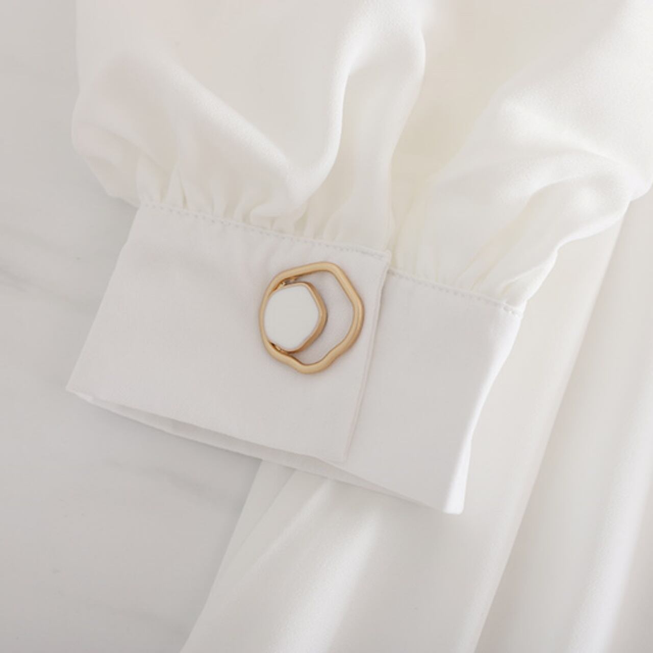 シャツ レディース トップス ブラウス 襟付き 長袖 ボリューム袖 ドロップショルダー ボタン バックタック 裾フレア Aライン 大人可愛い かわいい シンプル きれいめ 大人 上品 おしゃれ かっこいい こなれ感 ラフ ルーズ クール フォーマル 抜け感 3サイズ ホワイト 無地 10代 20代 30代 40代 学生 通学 OL オフィス 通勤 休日 デート お出かけ 女子会 ホームパーティー イベント 旅行 着回し 普段使い オルチャン ファッション トレンド 簡単コーデ スタイル モテ 体型カバー