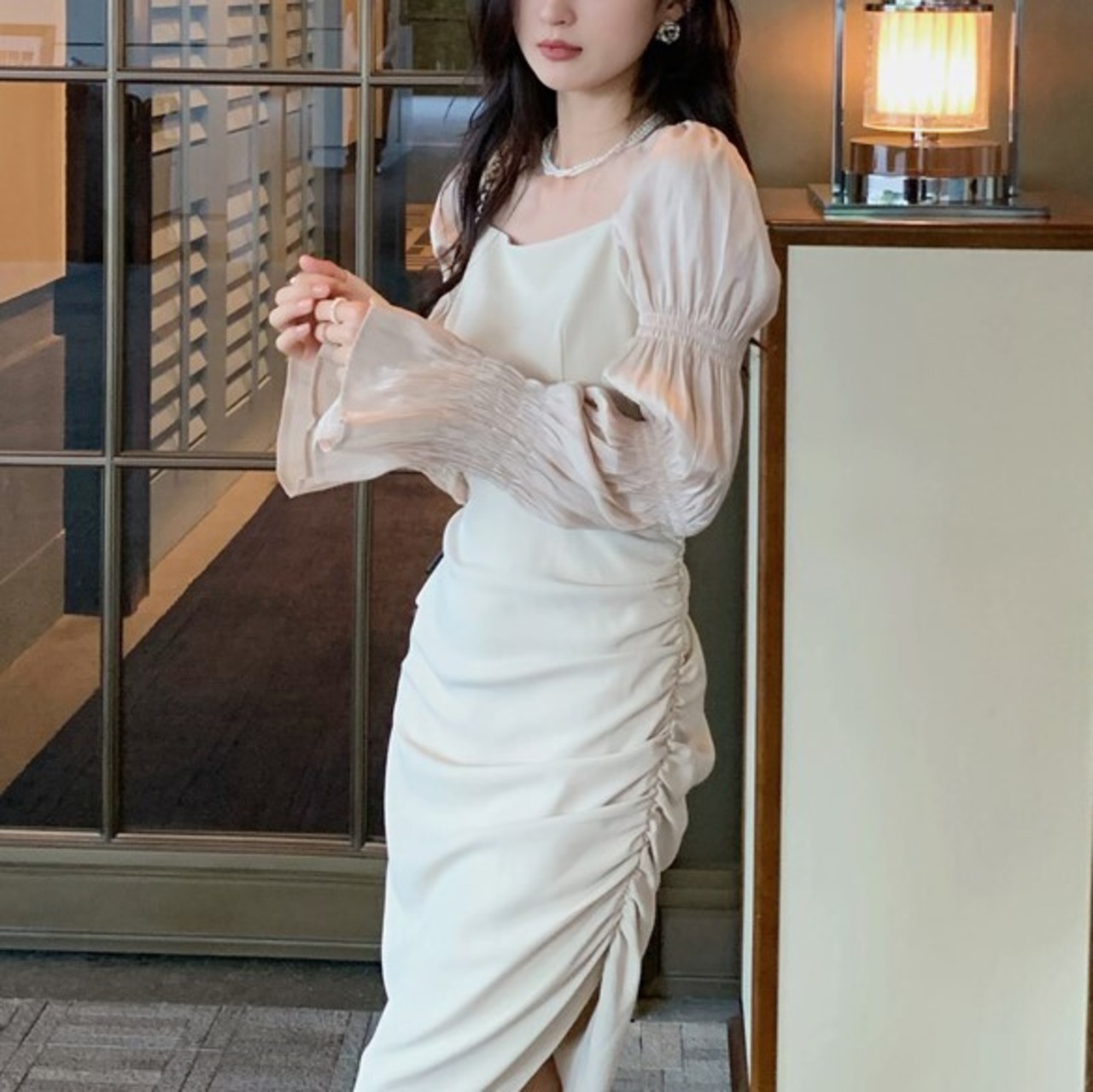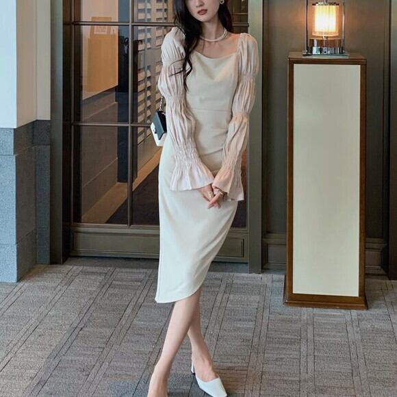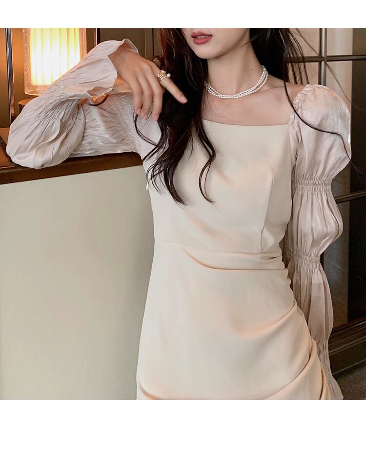 パーティードレス ワンピース ワンピ ドレス ミディアム ミディ丈 長袖 ロングスリーブ シャーリング イベント 秋 冬 新しい フレンチパフスリーブ ブラック アプリコット 女性 不規則 デザイン スクエア カラー スカート アシンメトリーデザイン トレンド 流行 人気 二次会 発表会 披露宴 ウエディング ディナー イベント メンズライク 主役級 ブラック S M L インポート ファッション インスタ映え ラブリー プチプラ ランキング 韓国デザインオルチャン 綺麗 大人クール スタイリッシュ