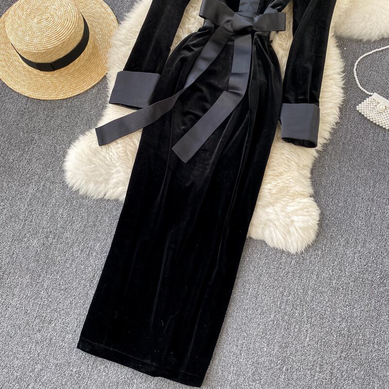 ワンピース レディース タイトワンピース ミモレ丈 袖あり 長袖 Vネック 襟無し スリム タイト 細身 ファスナー リボン ウエストマーク ベルベット かわいい 大人可愛い きれいめ 大人 上品 おしゃれ かっこいい 大人女子 こなれ感 セクシー エレガント 結婚式 二次会 披露宴 10代 20代 30代 OL 通勤 学生 通学 デート お出かけ 女子会 パーティー イベント リゾート 韓国系 オルチャン ファッション コーデ スタイル モテ 体系カバー 美脚 脚長 インスタ映え 無地 ブラック 冬