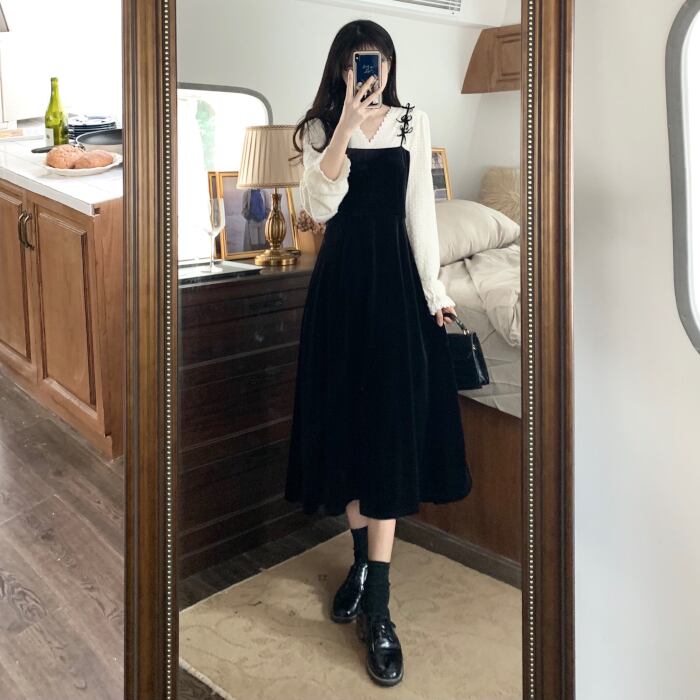 ワンピース フェイクワンピ ロングスカート リボン モノトーン 黒 ブラック ヒック 綺麗目 フレアスカート ロング丈 袖あり 長袖 萌袖 Vネック 襟なし かわいい 大人可愛い 大人 大人女子 きれいめ おしゃれ お洒落 可憐 シンプル ラブリー キュート ガーリー フェミニン 10代 20代 30代 通勤 学生 通学 デート お出かけ 女子会 休日 普段使い カジュアル こなれ感 ラフ ルーズ 抜け感 体系カバー ゆったり ゆる 楽ちん ママ マタニティ 上品 エレガント 披露宴 パーティー イベント