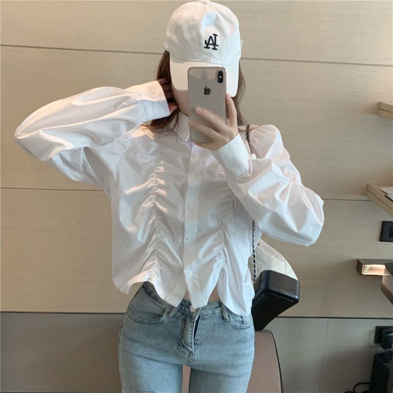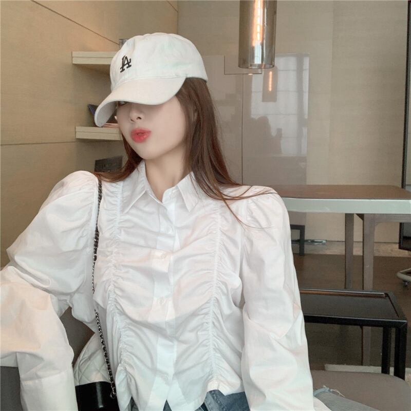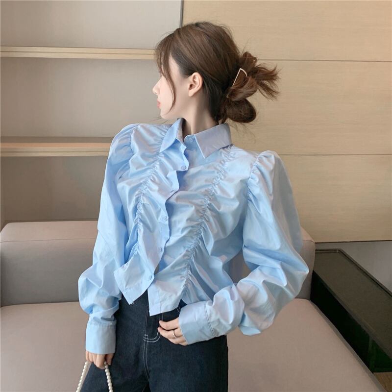 ブラウス レディース 女性用 パフスリーブ ショート丈 プリーツ POLO襟 ロングスリーブ コットン くすみカラー オールシーズン 韓国系 かわいい シンプル 大人可愛い カジュアル こなれ感 スポーティー マニッシュ モダン アジアン クラシック エレガント フォーマル ガーリー キュート ラブリー 存在感 10代 20代 オフィス OL 通勤 通学 学生 女子会 デート 謝恩会 母の日 誕生日 記念日 イベント 休日 お出かけ アウトドア 旅行 パーティー トレンド 普段使い 着回し 安定 双子