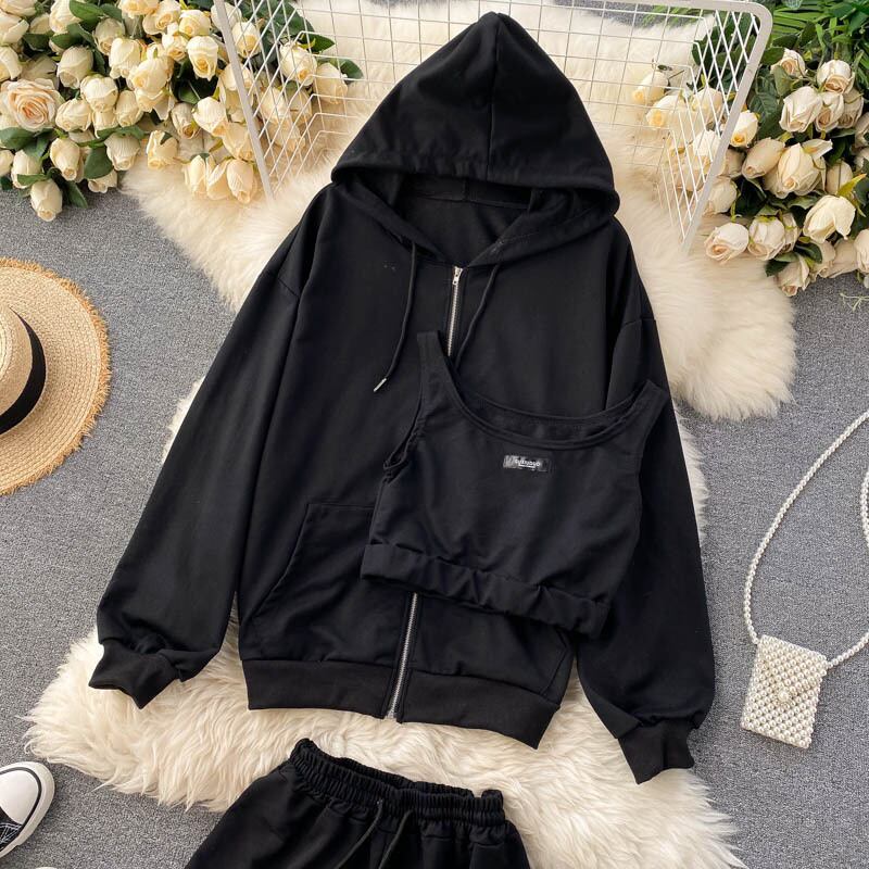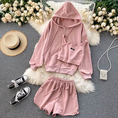 3点セット 秋 冬 スポーツ スポーティー 普段着 ストリート ファッション スーツ カジュアル フード付き オールマッチ ショートベスト ハイウエスト ワイドレッグ パーカー ショート パンツ タンクトップ ショート丈 ジム スポーツ ヨガ ボーイッシュ アウトドア リゾート 部屋着 リラックス 大人 女子 おしゃれ ブラック ホワイト ピンク ブラウン グレー ワンサイズ ラクチン 楽 インポートファッション プチプラ ランキング スポーツジム 体育会系 運動会 運動 エクササイズ プチプラ