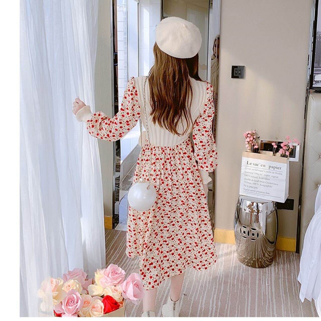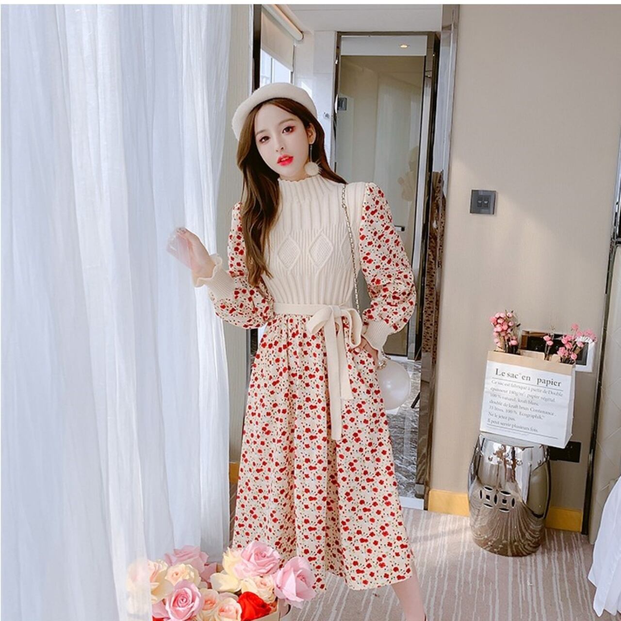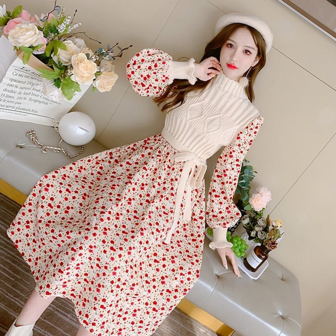 ワンピース レディース 小花柄 レイヤード アラン模様 ハイネック 長袖 ボリューム袖 ウエストリボン 膝下 ミモレ丈 Aライン 裾フレア かわいい カジュアル おしゃれ こなれ感 ラフ ラブリー キュート ガーリー フェミニン 個性的 主役級 抜け感 4サイズ 3カラー グリーン ピンク レッド 柄物 フラワープリント 春 秋 10代 20代 学生 通学 休日 デート お出かけ ショッピング 映画 公園 女子会 イベント 着回し 韓国 オルチャン ファッション コーデ 簡単コーデ モテ おすすめ