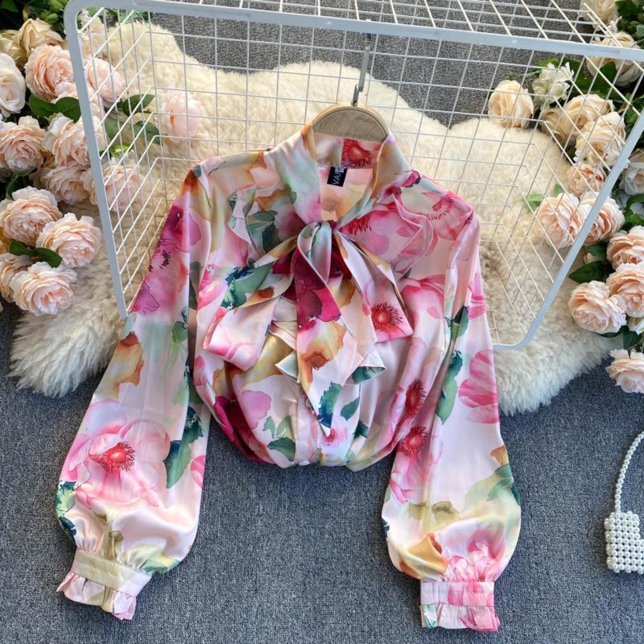 シフォン 長袖 シャツ レトロ ランタンスリーブ ルーズ 個性的 レディース ボウタイ パフスリーブ フラワー 花柄 ボタニカル トップス 襟付き 透け感 カラフル ピンク アート 全3サイズ S M L ファッション こなれ感 春 夏 秋 冬 10代 20代 30代 40代 50代 通勤 通学 学生 休日 楽ちん ボタン ボリューム袖 韓国 韓国風 オルチャン 着回し 普段遣い お洒落 おしゃれ お出かけ 重ね着 美術館 アーティスティック フリルタイ とろみ感 イベント 舞台 セレブ スタンドカラー